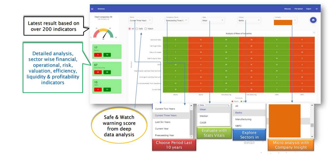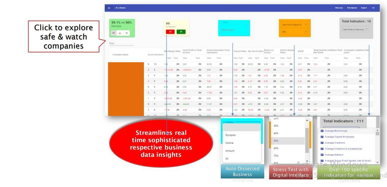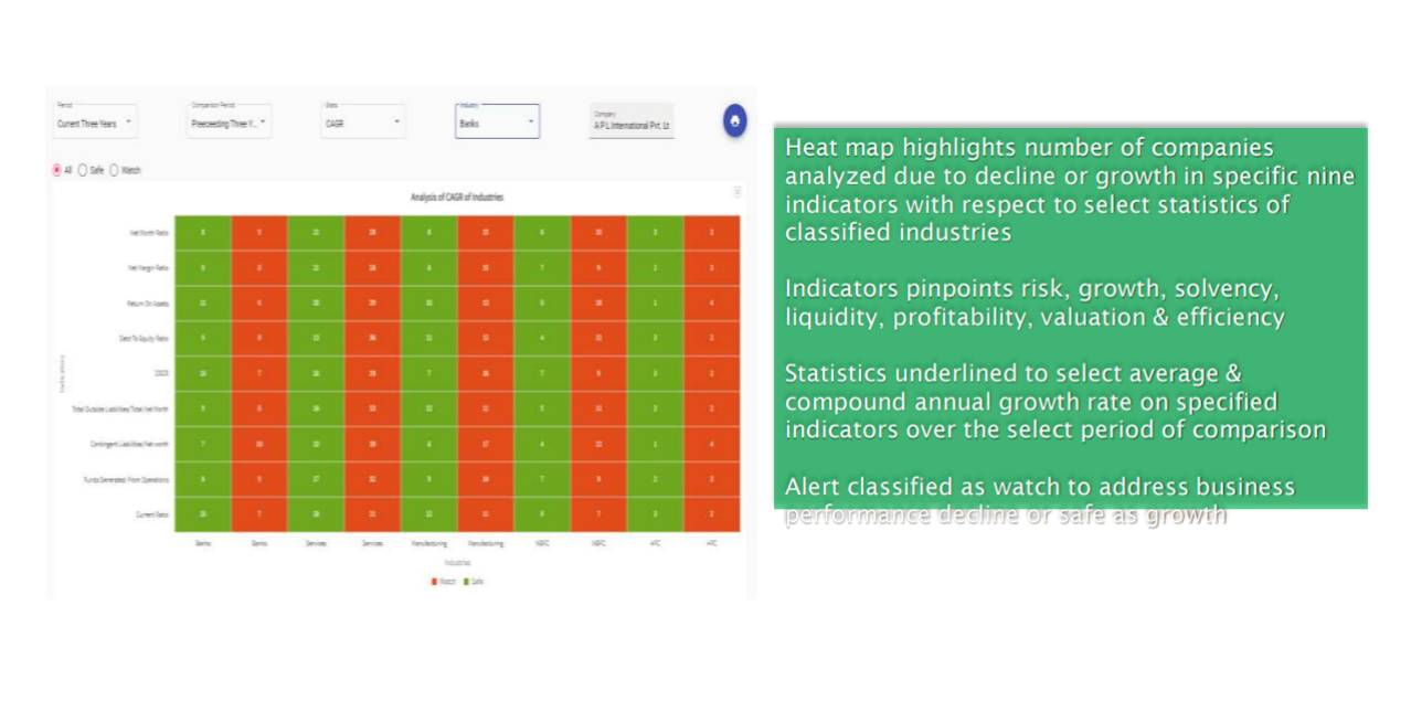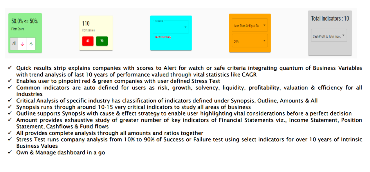 Selection of Industry Indicators to Synopsis, Outline, Amount or All, provides list of indicators from average 10 to over 100 with respective industry business intelligence keys Build Your Own Dashboard through deselecting or selecting desired indicators at a specific stress test level, with defined stats as CAGR etc. & required period for comparative trend analysis Total indicators incorporated are more than 250 of all industries with respect to business performance levels of risk, growth, solvency, liquidity, profitability, valuation & efficiency